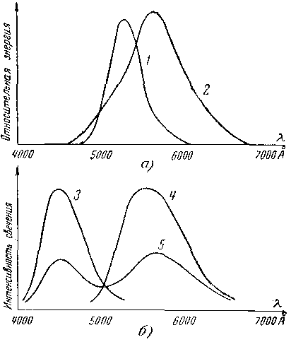 1 — спектральная характеристика виллемита; 2 — кривая чувствительности глаза; 3 — спектральная характеристика синей компоненты; 4 — спектральная характеристика желтой компоненты; 5 — характеристика экрана с белым свечением.