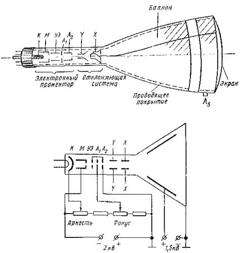 Рис.5.26. Внешний вид и электрическая схема осциллографической трубки.