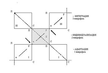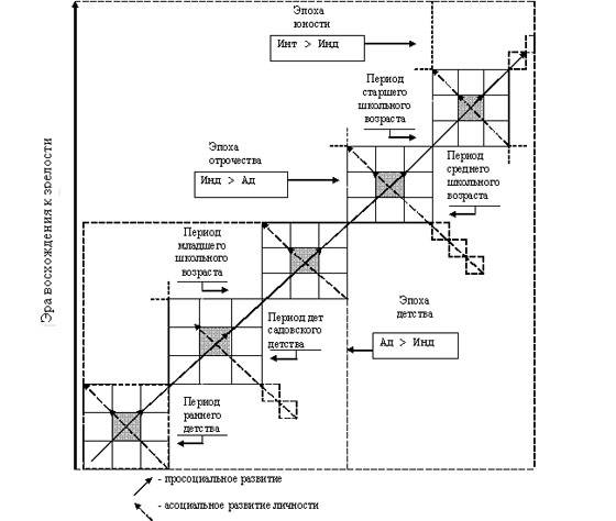 Эпохи подразделяются на периоды развития личности в конкретной среде, в характерных для каждого возрастного этапа типах групп, различающихся по уровню развития. Периоды, в свою очередь, как уже было указано, — на фазы (здесь уже микрофазы) развития личности. Эпоха детства — наиболее длящаяся макрофаза развития личности — охватывает три возрастных периода (преддошкольный, дошкольный, младший школьный), эпоха отрочества и период подросткового возраста совпадают. Эпоха юности и период ранней юности, в свою очередь, частично совпадают (ранняя юность /28/ ограничивается рамками пребывания в школе). Для первой макрофазы (эпохи детства) характерно относительное преобладание адаптации над индивидуализацией, для второй (эпоха отрочества) — индивидуализации над адаптацией, для третьей (эпоха юности) — превалирование интеграции над индивидуализацией.