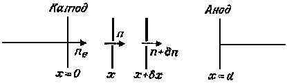 Пусть ne — число электронов, покидающих катод в 1 с, а n — число электронов, пересекающих за это же время сечение разрядной трубки в точке х (рис.4.5).