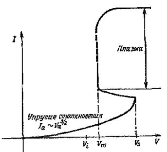 На рис.10.1 показана эквивалентная схема устройства для создания ртутной плазмы в стеклянной трубке (R— сопротивление, ограничивающее ток). При увеличении напряжения V от нуля ток I растет, поскольку он ограничен пространственным зарядом электронов (как и в случае высокого вакуума).