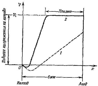 Вольтамперная характеристика такого устройства приведена на рис.10.2. При значениях напряжения выше Vi образуются положительные ионы, которые изменяют распределение заряда в лампе. При напряжении Vs в газе наступает пробой и напряжение падает до величины Vm (напряжение поддержания разряда), причем Vm немного больше Vi. Теперь ток может увеличиваться почти независимо от напряжения, и в газе образуется плазма. На рис.88 показано падение напряжения вдоль трубки: кривая 1 соответствует напряжению V <Vi, когда ток ограничен пространственным зарядом; кривая 2 —падение напряжения после образования плазмы.