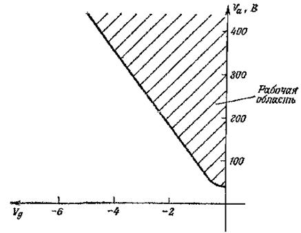 Ток через лампу течет только в том случае, если напряжения Va и Vg. попадают в заштрихованную область характеристики. Из рис.11.3 видно, что даже если отрицательное напряжение на сетке составляет всего лишь несколько вольт, то напряжение на аноде должно быть порядка 100 В, чтобы электроны, смогли пройти через отверстия в сетке, в количестве, достаточном для ионизации газа. Если происходит ионизация и образуется плазма, то для поддержания проводящего состояния требуется очень незначительный анодный потенциал.