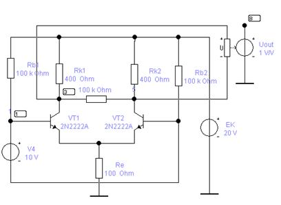 Рис.6.15а. demo6_4. Схема опыта для получения передаточной характеристики Uвых(Uвх) дифференциального усилителя на биполярном транзисторе.