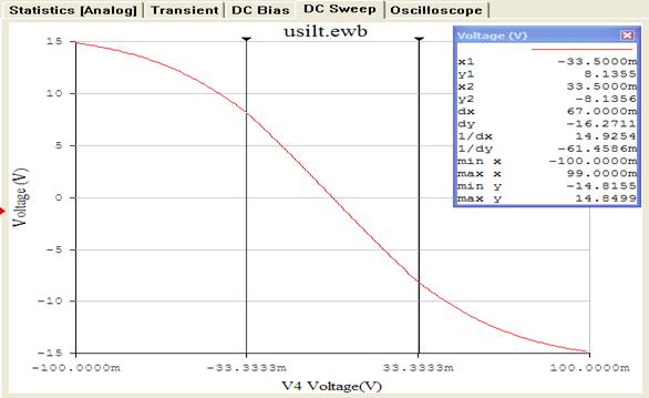 На рис.6.15б приведена передаточная характеристика дифференциального усилительного каскада на биполярном транзисторе. Линейный участок ее выделен вертикальными визирными линиями. На этом участке коэффициент усиления по напряжению составляет |dy/dx|=16.27В/67мВ≈243. За пределами линейного участка коэффициент усиления уменьшается.