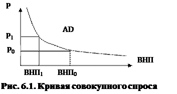 1. Как и в микроэкономике, в макроэкономике AD показывает отрицательный характер зависимости между уровнем цен и величиной спрашиваемых товаров и услуг. Чем выше общий уровень цен, тем ниже величина AD. Графическая иллюстрация этой зависимости показана на рис. 6.1.