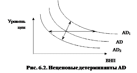 Ценовые детерминанты влияют на объем AD и отражаются движением вдоль кривой AD. Неценовые – влияют на характер AD и графически отражаются смещением кривой AD (вправо и вверх – если АD возрастает, влево и вниз – если АD снижается).
