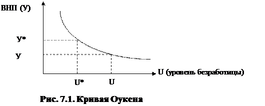 В условиях полной занятости при величине национального продукта У*, уровень безработицы составляет – U* (см. рис. 7.1). Если занятость понизится, то величина У уменьшится, а фактический уровень безработицы возрастет и составит U.