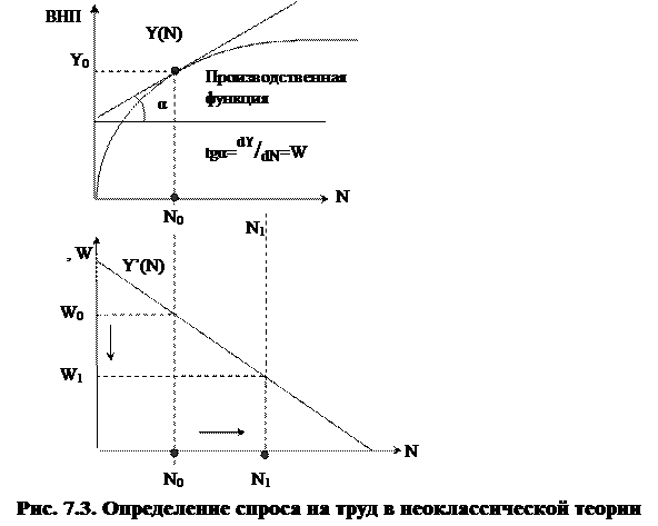 Наглядно определение спроса на труд можно проиллюстрировать графически, как это представлено на рис. 7.3. В верхней части рисунка представлена производственная функция Y(N). При возрастании только одного фактора труда (N) – действует закон убывающей отдачи, потому график Y(N) имеет вид выпуклой кривой. Предельная производительность труда характеризует спрос на труд, в зависимости от уровня заработной платы.