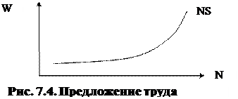 Предложение труда (NS) зависит от реальной ЗП, при этом NS абсолютно эластично к изменению ставки зарплаты. NS = f (W, +) – зависимость прямая (см. рис. 7.4.).
