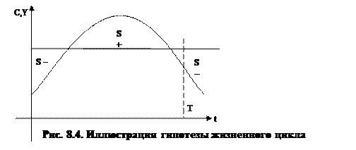 Почему же существуют сбережения (S)? Прежде всего, чтобы поддерживать стабильный уровень потребления, как утверждают сторонники гипотезы жизненного цикла (Андо и Модильяни). Поток дохода (Y) экономического агента минимален в начале и конце жизни. В эти периоды времени доход экономического агента меньше потребления (Y < C). В зрелые годы величина дохода поднимается и превышает потребление (Y > C). В целом за время человеческой жизни совокупные сбережения равны нулю (∑S = 0), т.е. человек полностью потребляет свой доход на протяжении жизни.