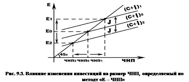 Чем больше инвестиционные расходы, тем выше и левее график Е. ВНП равновесный достигается в точки пересечения биссектрисы и кривой Е.