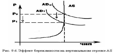 С другой стороны, бережливость иногда в национальной экономике может выступать как позитивное явление, и ее можно оправдать. Это достигается тогда, когда экономика работает на пределе своих возможностей, т.е. на вертикальном отрезке АS. Чтобы снизить уровень избыточного спроса необходимо больше сберегать, и это приводит к снижению цен (см. рис. 9.6.).