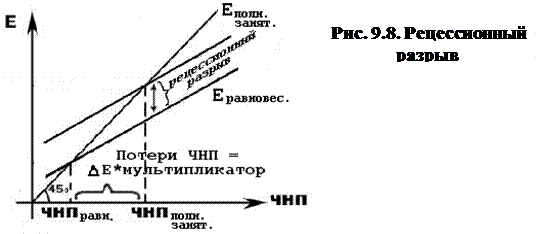 Графически (см. рис. 9.8.) рецессионный разрыв – это величина, на которую график совокупных расходов должен сместиться вверх, чтобы обеспечить безинфляционный уровень ЧНП в условиях полной занятости.