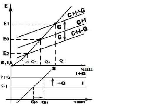 Первая основывается на изменении уровня налогообложения и абсолютной величины государственных закупок. Государственные расходы (G) увеличивают общую величину совокупных расходов (Е) на всю свою величину.