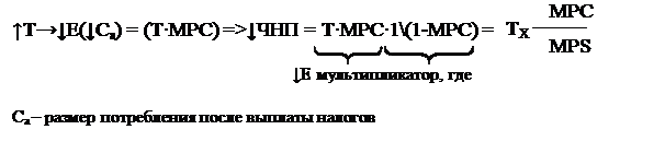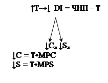 С другой стороны, рост налогов через сокращение располагаемого дохода (Уd = ЧНП - Т), приводит к сокращению размера изъятий в форме уменьшения сбережения (S) на следующую величину: ↓Sa = T • MPS