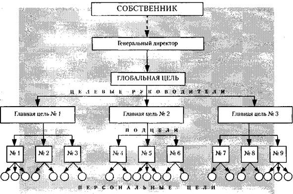 Линейное нефункциональное управления представлены на предприятии штатными руководителями и соответствующими подразделениями и работают в тесном взаимодействии. Типичная схема организации этой работы обычно такая. Функциональные отделы и бюро работают при линейном руководителе определенного уровня. Они – его помощники и советчики по специальным вопросам и пользуются его властью для ведения своей работы. Между функциональными подразделениями разного уровня (например, отделами предприятия и бюро цеха) существует линия прямого подчинения. Это дает возможность проводить на предприятии единую политику по специальным вопросам – экономическим, техническим, технологическим и др. Такая система всем достаточно хорошо знакома. Но в ней есть один серьезный изъян: будучи хорошо приспособленной для повседневного руководства, она слабочувствительна к целям управления. Между тем, не имея ясных целей управления, сроков их достижения, сведений о необходимых ресурсах, а главное – контролируемых показателей, свидетельствующих о приходе к цели, линейное и функциональное управления остаются как бы без компаса и карты: идти можем, но не знаем куда и сколько времени.