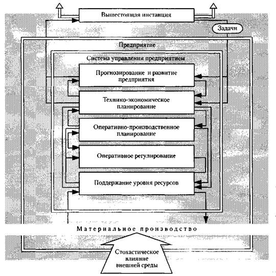 Система управления предприятием является многоуровневой. Иерархия уровней представлена на рис. 5.4. Материальное производство изображено в виде потока преобразования ресурсов, подверженного стохастическому влиянию внешней среды. Функцией управления, непосредственно связанной с материальным потоком, является функция обеспечения производственного процесса необходимыми ресурсами – предметами труда, орудиями труда и людьми, преобразующими предмет труда с помощью орудия труда в готовую продукцию. Для циклического осуществления данной функции необходима реализация продукции. Таким образом, в эту функцию входят наем и увольнение работников, поддержание запасов и реализация готовой продукции, обеспечение энергией, инструментом и ремонтом, поддержание на уровне основных производственных фондов.
