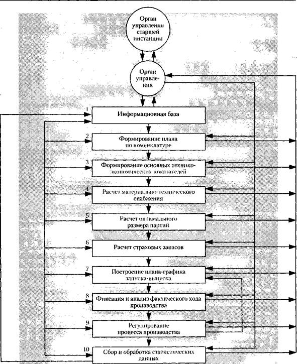 Затем решается ряд важнейших задач оперативного планирования: расчет оптимального размера партий, расчет страховых запасов, учет опережений и построение графика запуска-выпуска. Все эти задачи должны решаться с учетом рассчитанных страховых запасов по всем компонентам. После решения этих задач может быть начат производственный процесс. В ходе процесса происходит решение задачи его прохождения по всем необходимым параметрам. Через заданные промежутки времени, с установленной дискретностью, происходит решение комплекса задач регулирования производственного процесса и вводятся соответствующие управляющие воздействия на объекты управления – производственные подразделения. В этой связи особую важность составляют постоянный сбор статистических данных, их обработка, расчет корректур вероятностных характеристик параметров производства и управления с тем, чтобы страховые запасы всегда соответствовали обстановке.