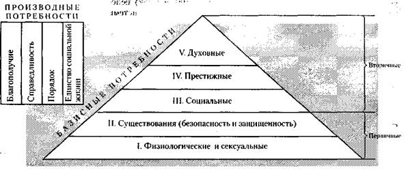 Все потребности делятся на две группы – базисные и производные. Базисные потребности носят постоянный характер и имеют свою иерархию; производные – изменяются и не имеют иерархии.