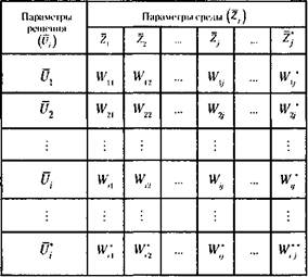 Элементами матрицы являются значения показателя эффективности, рассчитанные для сочетания параметра решения и параметра среды соответственно данной клетке матрицы. Так, элемент, записанный на пересечении j -го столбца и i -й строки матрицы, соответствует значению показателя эффективности, рассчитанному для значений параметров Ui и Zj.