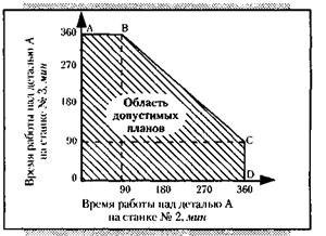 Любая точка заштрихованной области допустимых планов, как видно из ее названия, даст нам какой-либо один возможный план, отвечающий обоим принятым условиям – ограничениям. Так, например, точка О соответствует нашему глазомерному плану: время работы над деталью А на станках № 2 и № 3 равно нулю.