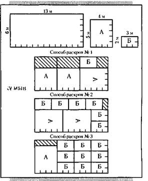 Перед нами листы дефицитного материала размером 6 х 13 метров (рис. 7.4). Из каждого такого листа необходимо выкроить по несколько заготовок двух видов: заготовки А – размером 5x4 метра и заготовки Б – размером 2x3 метра. Задача заключается в том, чтобы получить как можно больше заготовок обоих видов с наименьшим количеством отходов. Кроме того, как и в задаче со станками, необходимо обеспечить комплектность заготовок: на 1 заготовку А должно приходиться 5 заготовок Б.