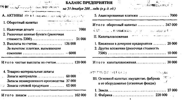 I. Оборотный капитал – состоит из наличных денег и тех средств, которые обращены в наличные в течение года до даты отчета при нормальном ходе событий производственно-хозяйственной деятельности. Составляющие оборотного капитала перечисляются в порядке убывания их ликвидности. Оборотный капитал включает: наличные деньги, рыночные ценные бумаги, выплаты по счетам, товарно-материальные ценности, авансированные платежи.