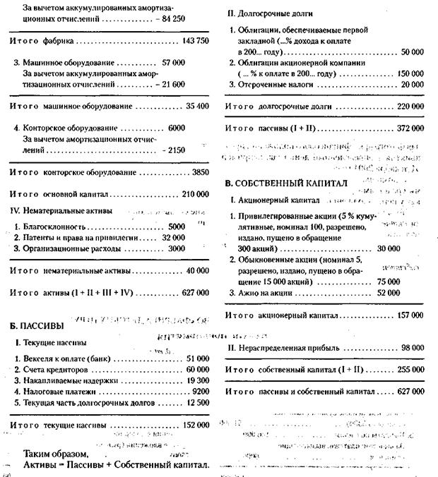 III. Основной капитал (основные фонды) – это стоимость земли, а также предприятия (фабрики), его имущества и оборудования, срок службы которых больше 1 года и не предназначен для продажи. Все части основного капитала, кроме земли, оцениваются по начальной цене за вычетом аккумулированных (реализованных) амортизационных отчислений. Амортизация – это распределение стоимости основных фондов на время их эксплуатации. Для земли устанавливается начальная цена. Составляющие основного капитала перечисляются в порядке убывания их постоянства: 1. Земля. 2. Фабрика. 3. Машинное оборудование. 4. Конторское оборудование. Содержание этих статей соответствует их названиям.