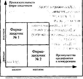 Состояние дел каждого заказчика наглядно отображается его позицией в системе прямоугольных координат (рис. 14.1), по горизонтальной оси которых откладываются относительные преимущества предприятия в конкурентной борьбе, а по вертикальной оси – привлекательность заказчика с точки зрения требований рынка.