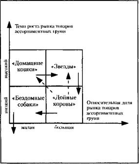 – анализ схемы приводит к ряду стратегических решений (они показаны на рис. 14.5 стрелками: сплошная указывает направление развития товаров по ассортиментным группам, а пунктирная – направление финансирования).