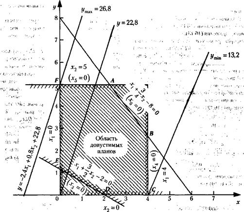 Поскольку мы добиваемся минимального значения у, то нас будет интересовать прямая, расположенная в наибольшем удалении вправо от прямой у = 22,8 и проходящая через многоугольник ABCDEF, – прямая ymin.