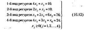 Смысл первого уравнения в нашем примере в том, что ресурс вида 1, общий ресурс которого составляет 16 единиц, может размещаться в количестве четырех единиц на предприятии первого типа и одной единицы – на предприятии четвертого типа. Аналогично раскрывается смысл второго и последующих уравнений. Последнее условие говорит о том, что число предприятий не может быть отрицательным.