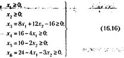 Каждому из неравенств (16.16) на графике рис. 16.1 соответствует полуплоскость, в пределах которой находятся все допускаемые данным неравенством значения переменной величины xj (j = 1, 2,..., 6). Так, неравенству x1 ³ 0 соответствует полуплоскость вправо от оси х2 (граница ее заштрихована). Неравенству x3 = 8 x1 + 12 х2 - 16 ³ 0 соответствует полуплоскость вправо и вверх от линии граничного значения данного неравенства (при х3 = 0). Уравнение этой линии: