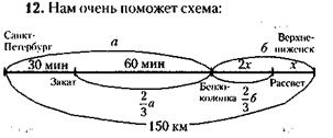 12. Обозначив расстояние от Санкт-Петербурга до бензоколонки через а, а от бензоколонки до Верхнениженска через б, сообразим в соответствии с условием задачи, что расстояние от поселка Закат до бензоколонки –