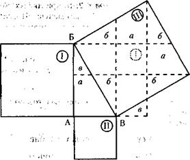 Кстати, мы только что доказали теорему Пифагора. Стороны квадратов I и II – это катеты, а стороны квадрата III – гипотенуза АБВ: сумма квадратов катетов равна квадрату гипотенузы. Просто и наглядно.