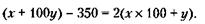 Второе уравнение составляется исходя из следующего, не очень заметного обстоятельства, содержащегося в условии задачи: сумма в тысячах рублей, превращенная в сумму в сотнях тысяч рублей, после того как из нее вычитаются три с половиной сотни тысяч, должна при делении на число сотен тысяч (теперь это тысячи рублей) дать без остатка число 2. Вот как можно записать это условие с учетом того, что число сотен тысяч нужно, кроме трех, уменьшить еще на единицу (из которой вычитается половина сотни тысяч):