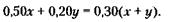 255. Обозначим через х искомое количество граммов компонента коктейля с 50 % спирта, а через у – с 20 % спирта. Тогда условие задачи можно записать в виде следующего уравнения: