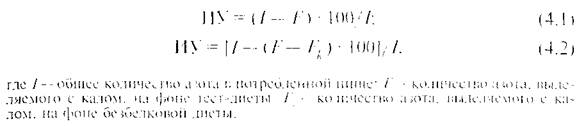Для определения усвояемости белка тмеряют содержание азота в пище и кале в опытах in vivo. Предполагаемую (ПУ) и истинную (ИУ) усвояемости белка — азота (7) рассчп гыпаюг в соответствии с формулами (4.1) и (4.2):