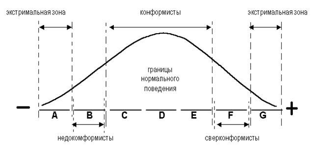 Поставив целью изучить многообразие форм проявления девиантного поведения американский социолог Р. Кевен построила теоретическую модель, описывающую взаимодействия индивида и общества. Она предложила континуум типов поведения от крайней девиации при низшем уровне конформизма, через промежуточные формы более или менее правильного поведения, до крайней девиации при «сверконформизме». Схема Р. Кевен представляет собой кривую Гаусса на горизонтальной прямой, разбитой на 7 равных сегментов.