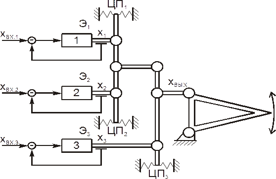 Принцип построения системы резервированного привода с суммированием перемещений выходных звеньев исполнительных механизмов показан на рис.3.1.