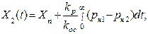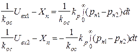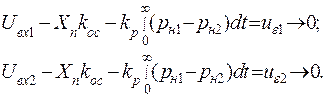В этих выражениях Uвх1,2 - управляющие сигналы, kp - коэффициент усиления в цепи обратной связи по разности перепадов давления, а ue1,2 - оценка ошибки управления.