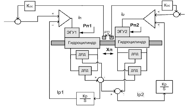 Схема симметричной системы разгрузки конструкции двухканального привода с жёстким соединением штоков на общем выходном звене. Здесь приняты обозначения: i1, i2 – токи управления в обмотках ЭГУ; ДПП – датчики поступательных перемещений; Рп1, Рп2 – давление подачи в приводах; Хп – перемещение поршней гидроцилиндров; Кр – коэффициент передачи цепи выравнивания давления в гидроцилиндрах; Ip1, Ip2 – интегральные оценки разности перепадов давления на поршне гидроцилиндров.