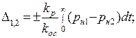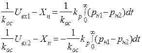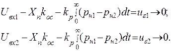 В этих выражениях: Uвх1,2 - управляющие сигналы, kp - коэффициент усиления в цепи обратной связи по разности перепадов давления, а ue1,2 - оценка ошибки управления.