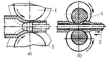 Рис. 4.6. Схемы прокатки труб на автоматическом (а) и пилигримовом (б) станах
