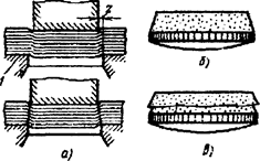 В процессе гибки элементы заготовки деформируются не одинаково (рис. 4.21, а). Наиболее нагружены крайние сечения, именно в них напряжения раньше всего достигают предела текучести (рис. 4.21, б). При дальнейшем изгибе материала в процесс деформации вовлекаются все более глубокие слои волокон (рис. 4.21, в).