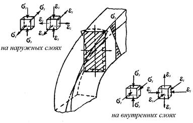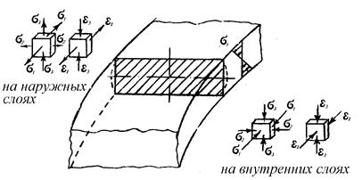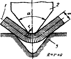 При гибке широкой полосы возникает объемно-напряженное и плоско-деформационное состояние, поскольку в широкой полосе в большей части волокон не происходит поперечной деформации. При гибке широколистовых материалов (B>>S) при больших радиусах гибки можно упрощенно принять схему линейно напряженного состояния (рис. 4.20).