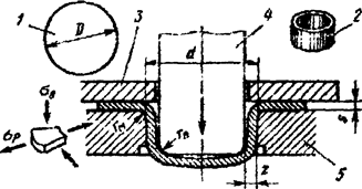 1 – заготовка; 2 – изделие; 3 – прижим; 4 – пуансон; 5 - матрица