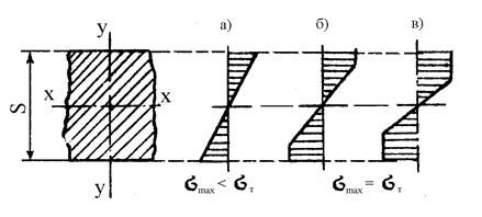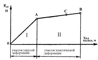 Рассматривая процесс гибки заготовки, на диаграмме (рис. 4. 26) можно выделить два участка: участок упругой деформации (линия ОА) и участок пластической деформации (линия АВ). Распределение напряжений по сечению заготовки показано на рис. 4.27. Очевидно, что необратимые пластические деформации в заготовке достигаются только на 2-м участке (рис. 4.27, б, в). При этом по мере уменьшения радиуса гибки усилия гибки (на среднем валке) будут возрастать за счет вовлечения все большего слоя металла в процесс пластической деформации (рис. 4.27, в).