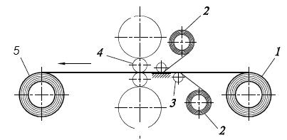 1 – разматыватель с рулоном основного слоя; 2 – разматыватель с рулоном полосы плакирующего слоя; 3 – направляющие ролики; 4 – рабочие валки прокатного стана; 5 – моталка с рулоном трехслойной полосы.